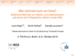 Leitung: Lena Hipp, PhD, Leiterin der Nachwuchsgruppe „Work & Care“ am Wissenschaftszentrum Berlin für Sozialforschung (WZB) & Prof.Dr. Ulrich Kohler, Lehrstuhl für Methoden der empirischen Sozialforschung an der Universität Potsdam